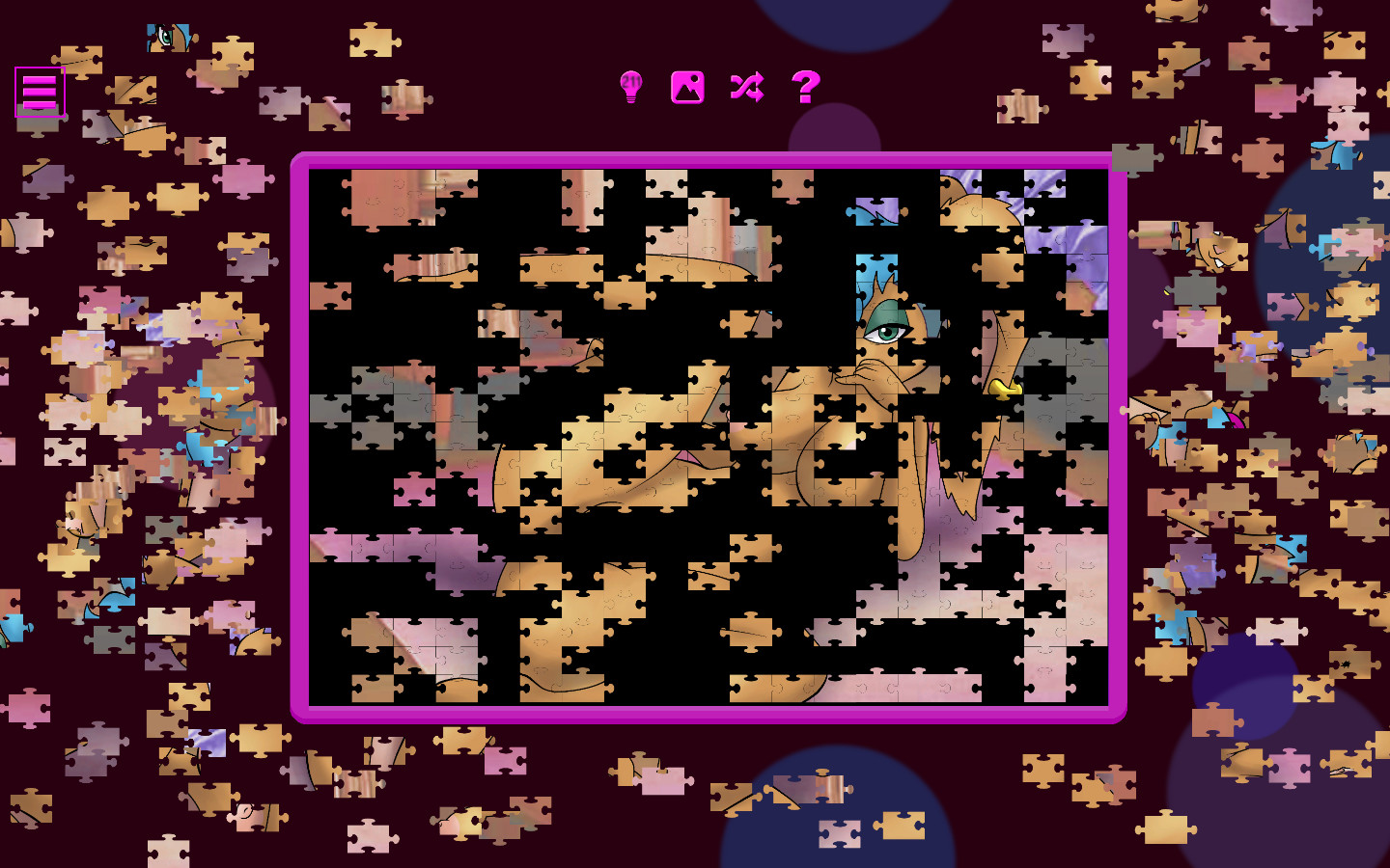 • Features include zooming in on the full scene, highlighting the puzzle's edge pieces, shuffling the remaining pieces, hinting.