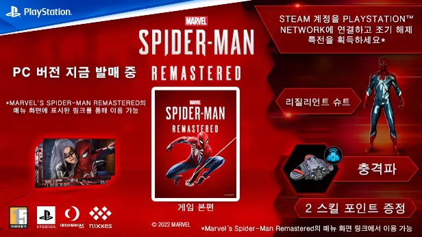 Marvel과 협력하여 Insomniac Games가 개발하고, Nixxes Software와의 협업으로 PC 사용을 위해 최적화한 Marvel’s Spider-Man Remastered는 마블의 뉴욕시에서 거대 범죄 및 상징적인 빌런과 싸우는 노련한 피터 파커를 소개합니다. 동시에, 수많은 뉴욕 시민들의 운명을 어깨에 짊어진 그는 자신의 혼란스러운 사생활과 직장 사이에서 균형을 맞추려 노력합니다.