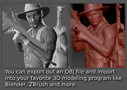 You can export your 3D posed characters into your favorite 3D modeling and sculpting programs like Blender, Zbrush, Nomad Sculpt, and more!