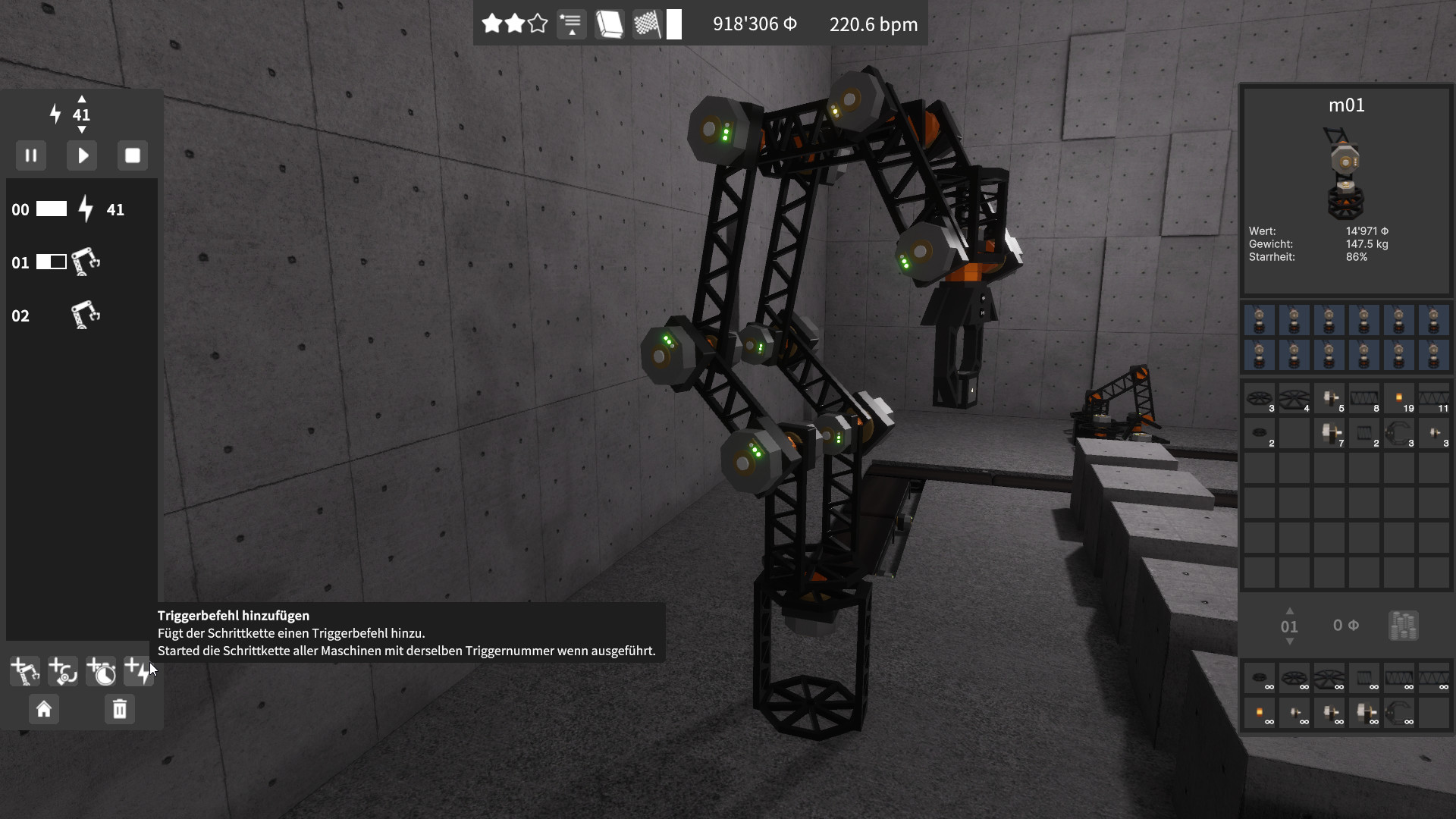 Maschinen wie auch Blöcke werden naturgetreu in Echtzeit simuliert. Maschinen brauchen Motoren um angetrieben zu werden. Glieder an denen viele Bauteile befestigt sind sind schwerer und benötigen deshalb einen stärkeren Motor. Verwende einen zu schwachen Motor und das Glied bewegt sich im Schneckentempo (der Motor ist überlastet).