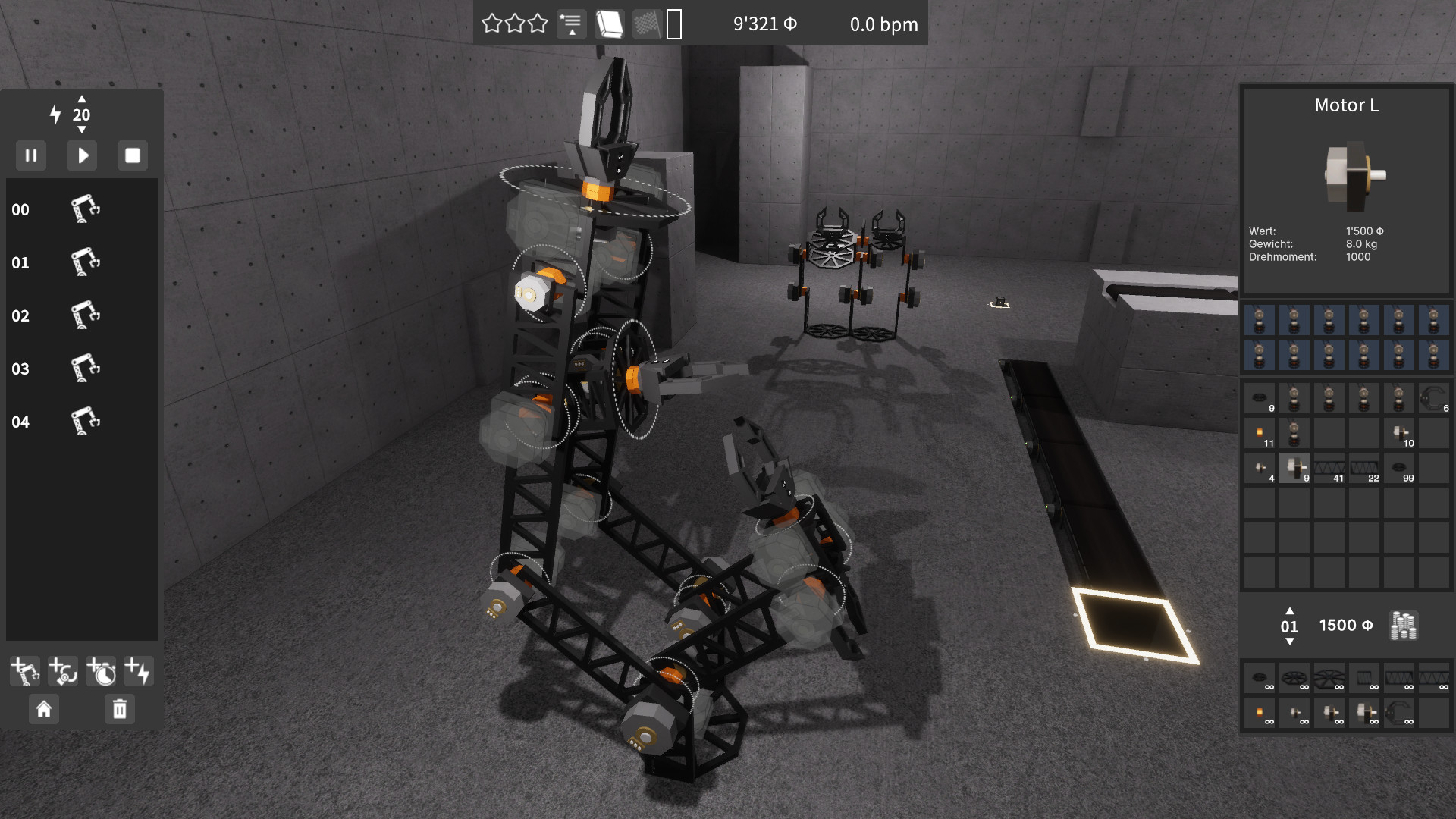 Maschinen wie auch Blöcke werden naturgetreu in Echtzeit simuliert. Maschinen brauchen Motoren um angetrieben zu werden. Glieder an denen viele Bauteile befestigt sind sind schwerer und benötigen deshalb einen stärkeren Motor. Verwende einen zu schwachen Motor und das Glied bewegt sich im Schneckentempo (der Motor ist überlastet).