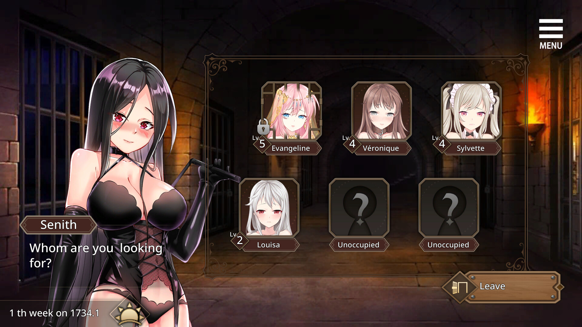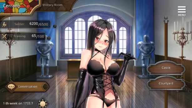 When the territory reaches the "Policing" standard, the player will catch 6 women suspected of being spies as the game progresses. The women have attributes such as "Preference," "Dislike," and "Sexual Fetish." The player can use commands such as "Gaze," "Touch," "Kiss," "Hug," "Glare," "Insult," "Lick earlobe," "Kiss chest," "Tease private parts," "Rub butt," "Slap roughly," and "Beat abdomen" on the women to perform foreplay and choose sexual activities like "Penetrate vagina," "Penetrate anus," "Gang rape," etc. Options to have sex include "Thrust gently," "Thrust intensively," "Thrust roughly," and "Ejaculate." Depending on the result of the tutelage, you can raise the "Hentai-level" of the women and decide whether to find the "Spies" to save your life.