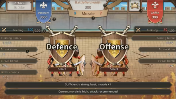 The game is a visual novel with strategic elements. Players take on the role of Norman's strongest legion commander and "Attack" to recover territory, then "Transfer" to defend territory. During the battle, "Attack" or "Defend" is decided with reference to "Morale,” where the result of "Morale" determines the victory or defeat of each battle round.