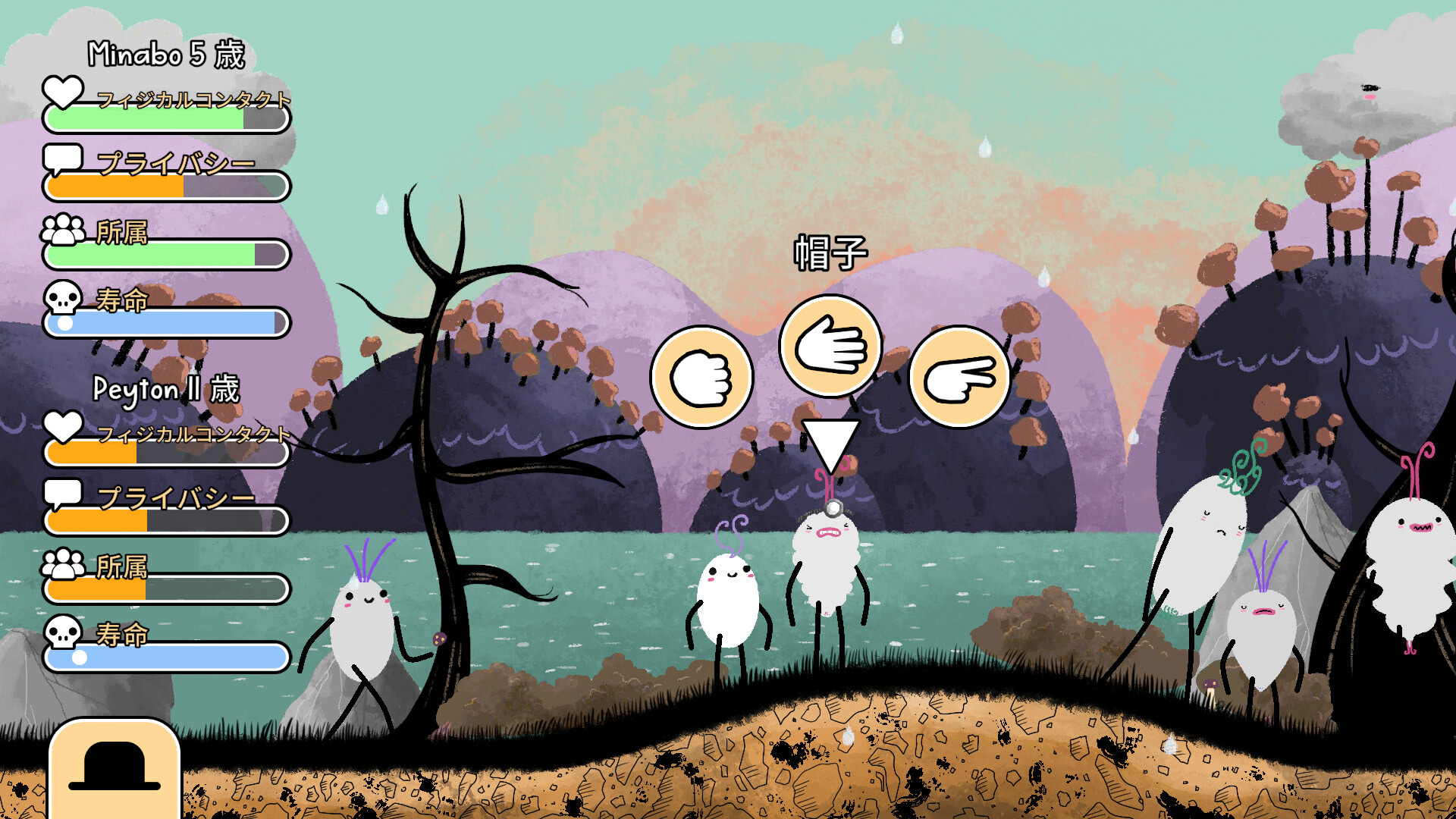他のダイコンとの良い関係を育むことは簡単ではありません。そこで「マイダイコン-Daikon Simulator」では、かぶると様々な効果(好かれたり、嫌われたり、エレガントになったり、寿命の長さが変わったり)がある帽子を取り入れました。