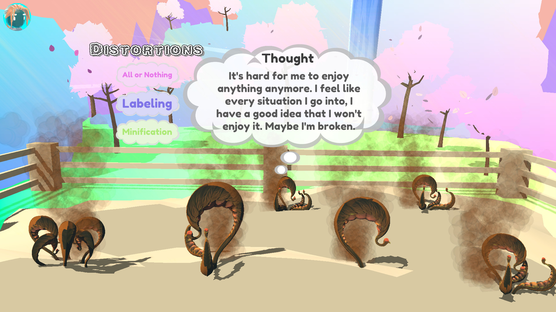 You are given the role of the Mind Gardener. It is your task to maintain the thoughts of your person, and in doing so try to relieve some of their anxiety and depression. Every mind gardener knows a little bit of CBT (Cognitive Behavioral Therapy), which allows you to categorize distorted thoughts and afterwards replace them with realistic thoughts. You start with a person whose only thoughts are distorted, and you must work your way towards a healthy-minded individual.