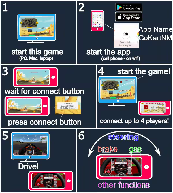 You will be using your cellphone(s) to control GoKart(s) - cellphone has to be connected to the same local network as the computer running the game. Free apps available for Android and iPhone - search for GoKartNM (white helmet icon).
