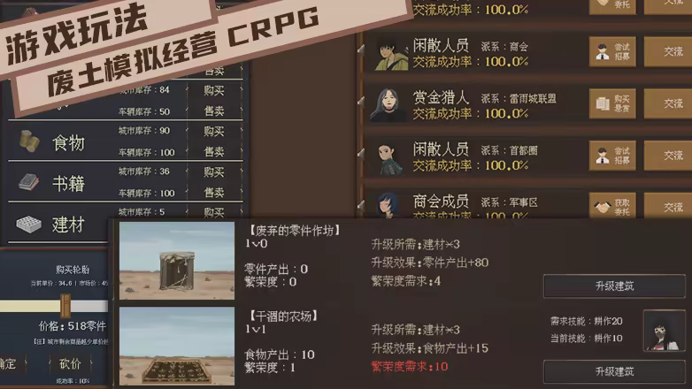 -接受委托,狩猎赏金猎人,营建城市,倒卖商品,搜刮废土。多种方法壮大自己