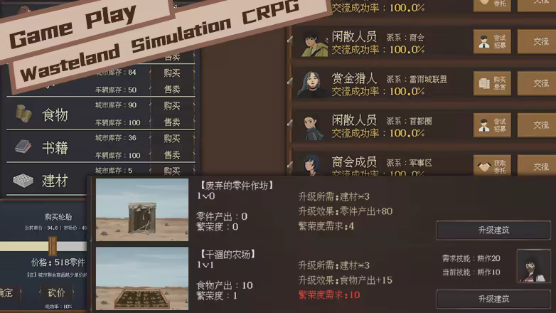-Accept entrustment, hunt bounty hunters, build cities, resell commodities and search for waste land. There are many ways to grow yourself