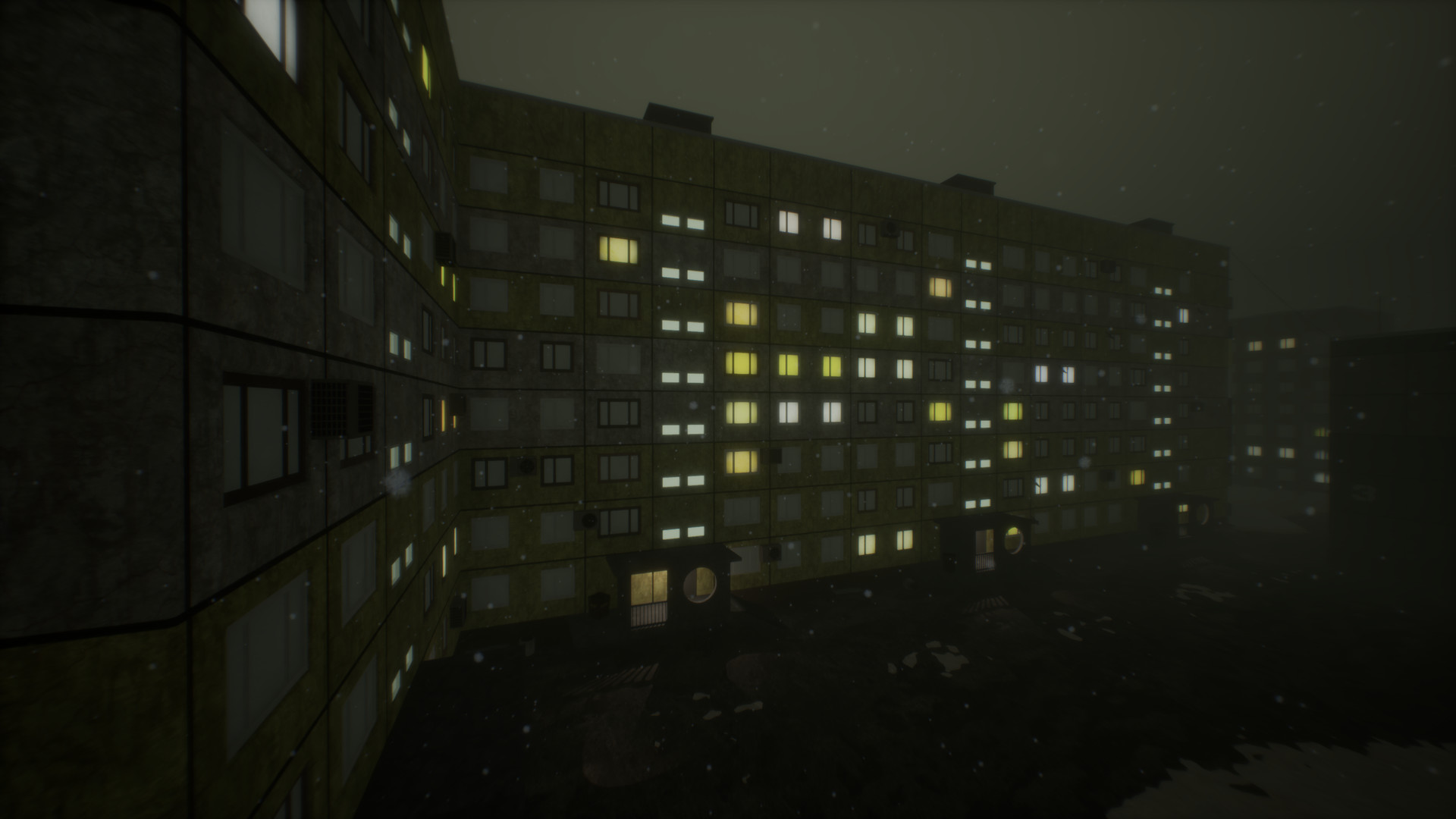 You enter the endless open world of the city of panel houses. It consists a lot of procedurally generated objects: roads, houses, playgrounds, garages, schools and other structures. The main feature of the Sibreain city are panel houses, uniquely generated both outside and inside. No house is like any other.