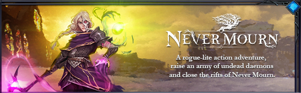 Explore the world of Never Mourn in this rogue-lite action adventure. Death is never the end, merely the beginning of your next adventure. Use ancient necromantic magics to raise an army of undead daemons and do battle to close the rifts of Never Mourn.