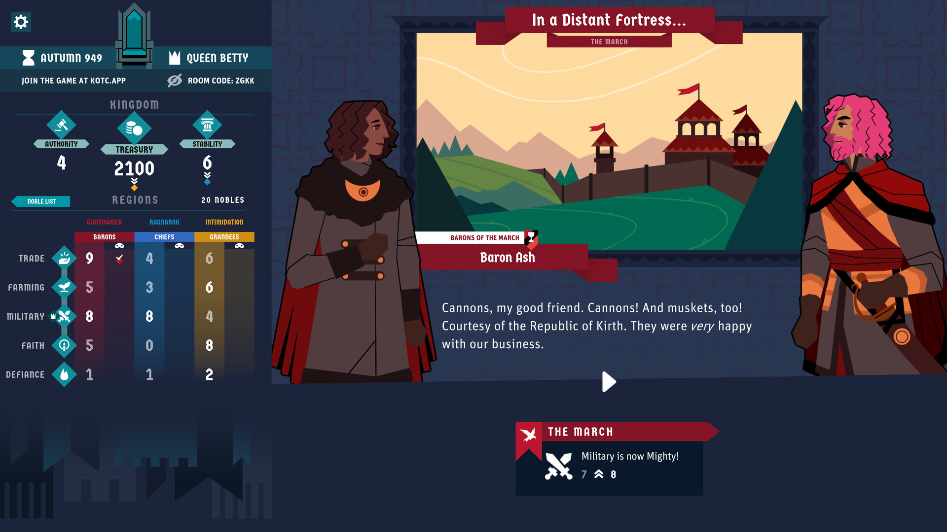 King of the Castle is a multiplayer game of shifting power dynamics and intrigue. Host games of 3 to 24 other players who join as the 'loyal' Nobles of your Council, voting on your decisions - and twisting the story to their own sinister ends.