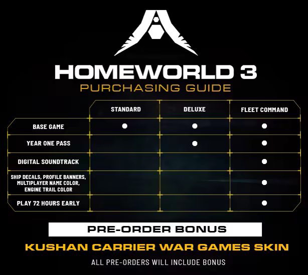 I contenuti extra dell'edizione Fleet Command di Homeworld 3 includono il set di personalizzazione multigiocatore e la colonna sonora digitale. Inoltre sblocchi l'accesso al gioco con 72 ore di anticipo.