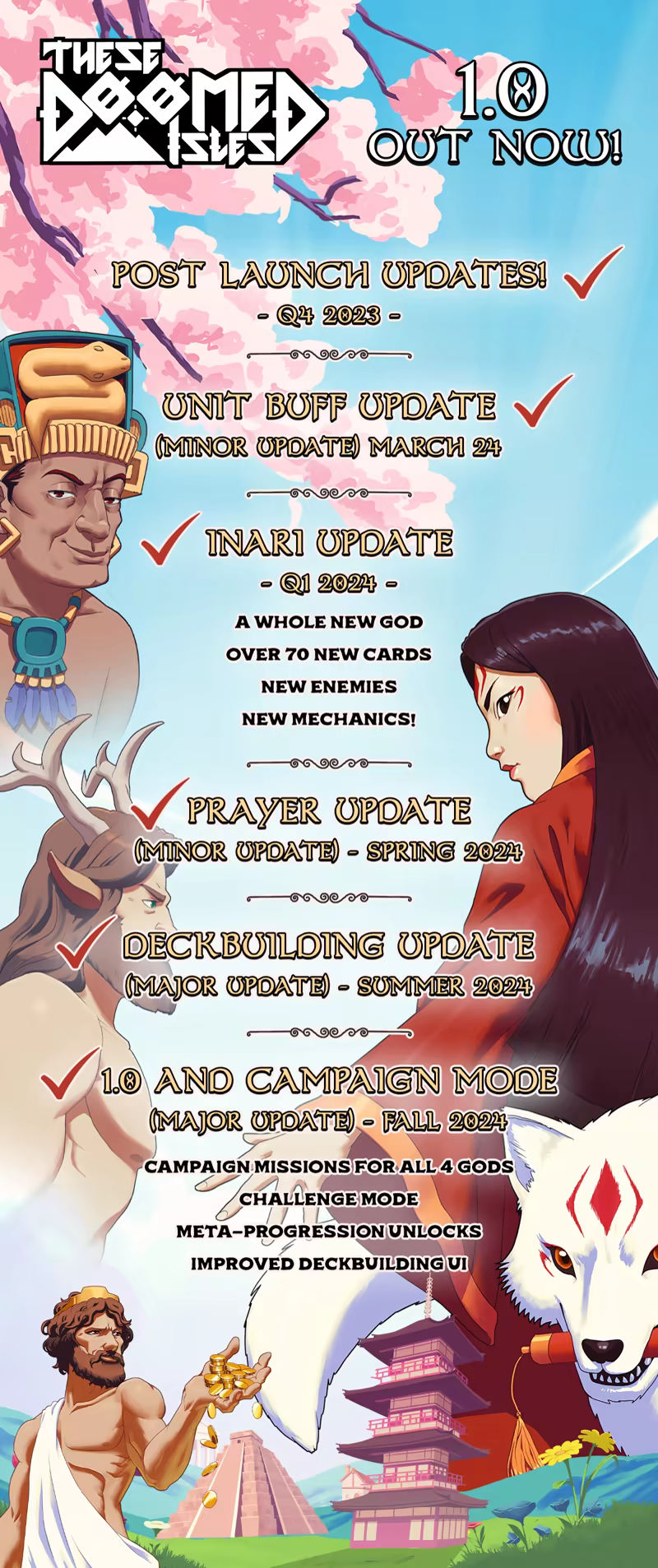 Juega a ser dios en este juego de supervivencia y construcción de ciudades con mecánicas de «roguelike» y creación de mazos. Cosecha cartas para elevar la tierra del mar, construye asentamientos para tus seguidores y lanza una lluvia de fuego sobre oleadas de invasores. ¡Elige entre 4 dioses con cartas, habilidades y estilos de juego exclusivos para llevar a sus civilizaciones a la victoria! Tenemos planeado añadir al juego más dioses, cartas, enemigos y mucho más durante el acceso anticipado.