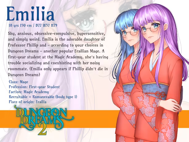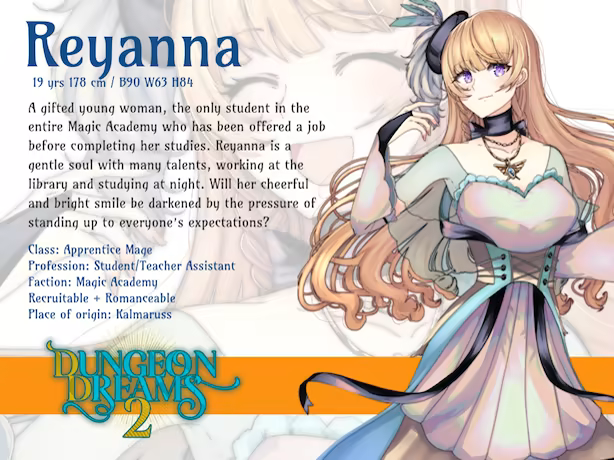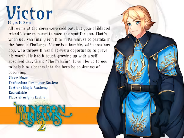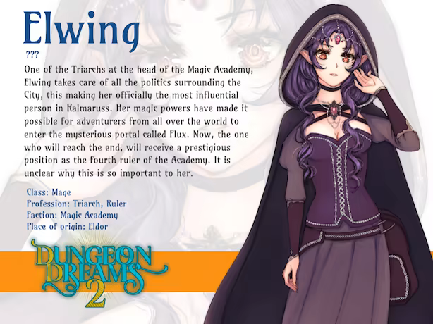 This is the sequel to Dungeon Dreams, but can be played as a new game as well. You play as the child of the Champion of Ecallia, who moves to the big City of Kalmaruss to take part in an important Challenge led by Lady Elwing, one of the Triarch of the Magic Academy. The winner will be literally given the keys to the City and the Academy, so what are you waiting for? Join Victor, your childhood friend, who's already studying at the Academy and who saved a spot in the dormitory just for you! Explore freely the City during day and night, discovering highlights such as the Merchant's Guild, Konrad's weapon shop, the Elven Community, or sit down for some fine sushi with your friends, at the gourmet restaurant with fresh fish taken directly from the lake surrounding Kalmaruss.