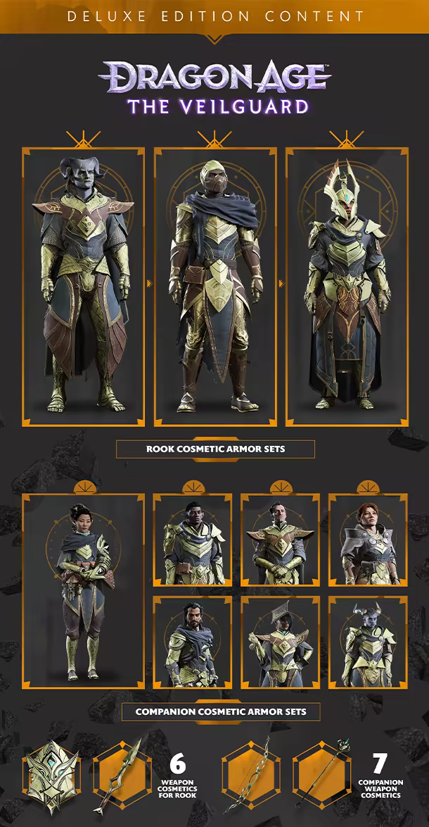 Obtain a variety of weapons and armor, including curiosities from a forgotten era, with the Deluxe Edition. You’ll receive cosmetic weapon and armor sets for the Warrior, Mage, and Rogue classes as well as cosmetic armor sets and weapons for each of your 7 companions. That’s 3 armor sets for Rook, 6 weapons for Rook, 7 companion armor sets, and 7 companion weapons — saving Thedas never looked so good.