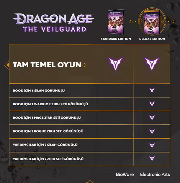 Deluxe Edition ile unutulmuş bir dönemin tuhaflıkları da dahil olmak üzere çeşitli silah ve zırhları elde edin. Warrior, Mage ve Rogue sınıfları için kozmetik silah ve zırh setlerinin yanı sıra 7 yardımcınızın her biri için kozmetik zırh setleri ve silahlar alacaksınız. Rook için 3 zırh seti, Rook için 6 silah, 7 yardımcı zırh seti ve 7 yardımcı silah ile Thedas'ı kurtarmak hiç bu kadar iyi görünmemişti.