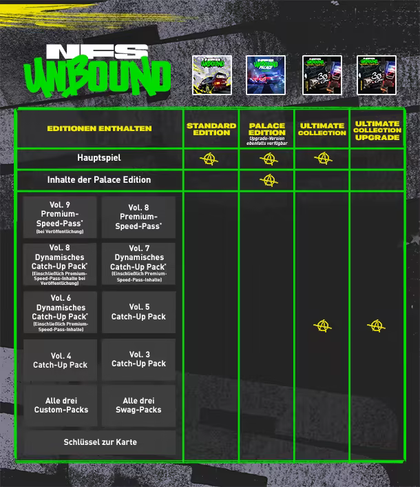 Entfessle das ultimative Need for Speed Unbound-Erlebnis mit der Ultimate Collection. Die Collection umfasst das Basisspiel von Need for Speed Unbound, sofortigen Zugriff auf alle nachträglichen Premium-Inhalte und den Vol. 9 Premium-Speed-Pass. Sichere dir 9 vollständig anpassbare Wagen, über 45 Tuningteile und über 100 kosmetische Gegenstände.