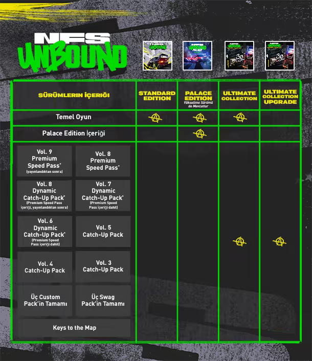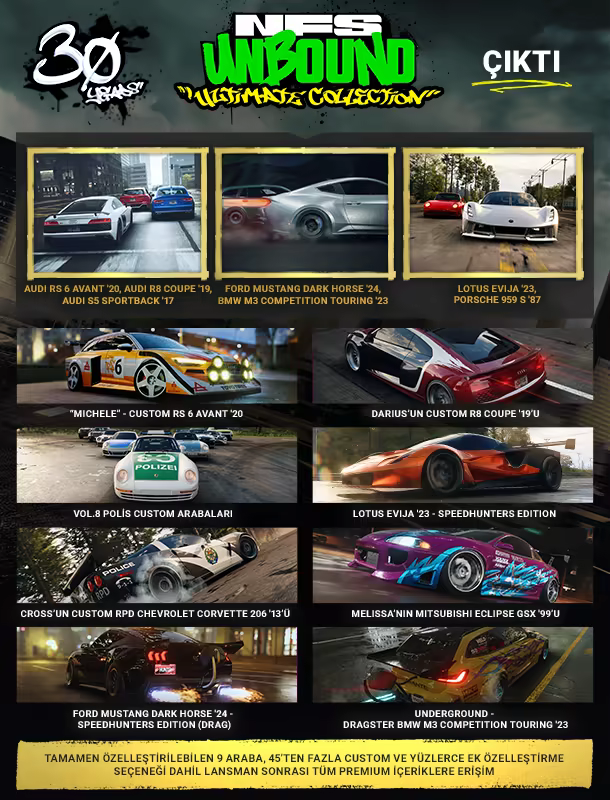 Ultimate Collection ile tek pakette en büyük Need for Speed Unbound deneyimini ortaya çıkarın. Koleksiyon Need for Speed Unbound’u, lansman sonrası tüm premium içeriklere ve Vol. 9 Premium Speed Pass’e anında erişimi içerir. Tamamen özelleştirilebilen 9 arabaya, 45’ten fazla Custom’a ve 100+ ek kozmetik ögesine erişim elde edin.