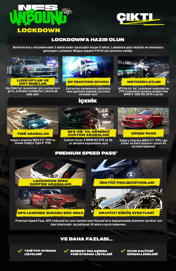 • VOL. 9: LOCKDOWN: Ekibinizle sonuna kadar yarışın. NFS’nin ilk motosikletiyle Lockup’lara girerek içerideki nefis araçları alın. Öte yandan tamamen özelleştirilebilen Subaru Impreza WRX STI ’99 ve Honda Integra Type R ’98 geliyor
