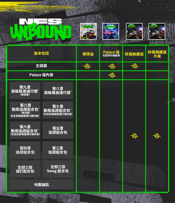 • 第七章動態追趕包(包括高級飆速通行證內容)