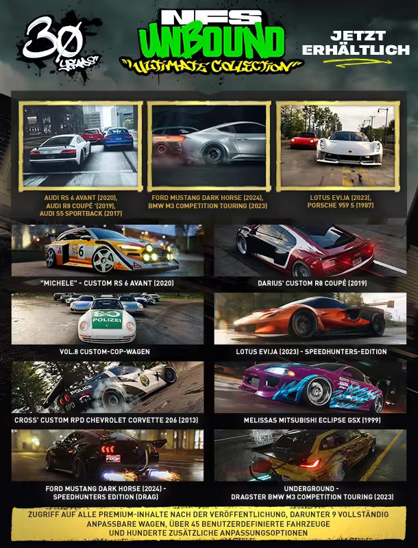 Entfessle das ultimative Need for Speed Unbound-Erlebnis mit der Ultimate Collection. Die Collection umfasst das Basisspiel von Need for Speed Unbound, sofortigen Zugriff auf alle nachträglichen Premium-Inhalte und den Vol. 9 Premium-Speed-Pass. Sichere dir 9 vollständig anpassbare Wagen, über 45 Tuningteile und über 100 kosmetische Gegenstände.