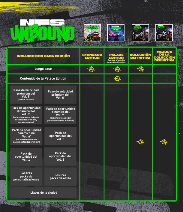 Da rienda suelta a la experiencia definitiva de Need for Speed Unbound en un solo paquete con la colección definitiva. La colección incluye Need for Speed Unbound, acceso instantáneo a todo el contenido prémium poslanzamiento y al pase de velocidad prémium del Vol. 9. Obtén acceso a 9 coches totalmente personalizables y más de 45 personalizaciones y 100 artículos estéticos adicionales.