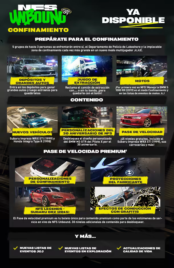 • VOL. 9: AISLAMIENTO — Ve a muerte con tu equipo. Entren en los depósitos con la primera moto de NFS y reclamen los grandes autos de su interior, además llegan el Subaru Impreza WRX STI (1999) y el Honda Integra Type R (1998) totalmente personalizables.