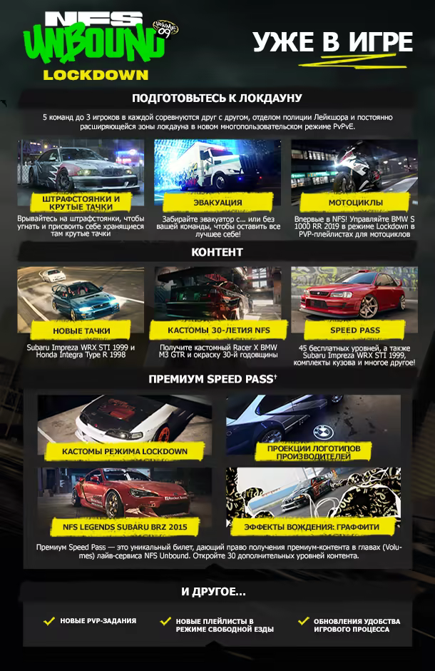 • VOL. 9: LOCKDOWN. С командой до конца. Врывайтесь на штрафстоянки на первом мотоцикле в NFS и угоняйте хранящиеся там крутые тачки. А еще встречайте полностью настраиваемые Subaru Impreza WRX STI 99 и Honda Integra Type R 98