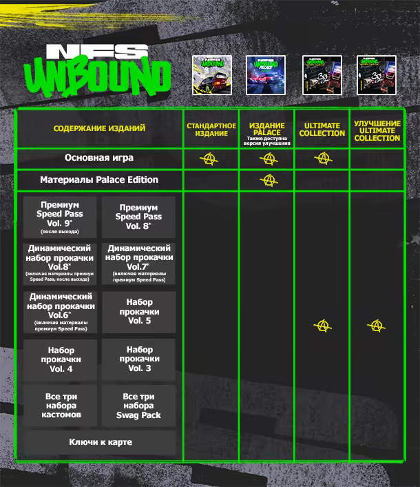 Получите максимальные впечатления от Need for Speed Unbound в одной Ultimate Collection. Коллекция содержит Need For Speed Unbound, моментальный доступ ко всему премиум-контенту, который появится в игре после выхода, и премиум-контент Speed Pass Vol. 9. Вас ждут 9 полностью настраиваемых машин, более 45 кастомов и более 100 дополнительных украшений.