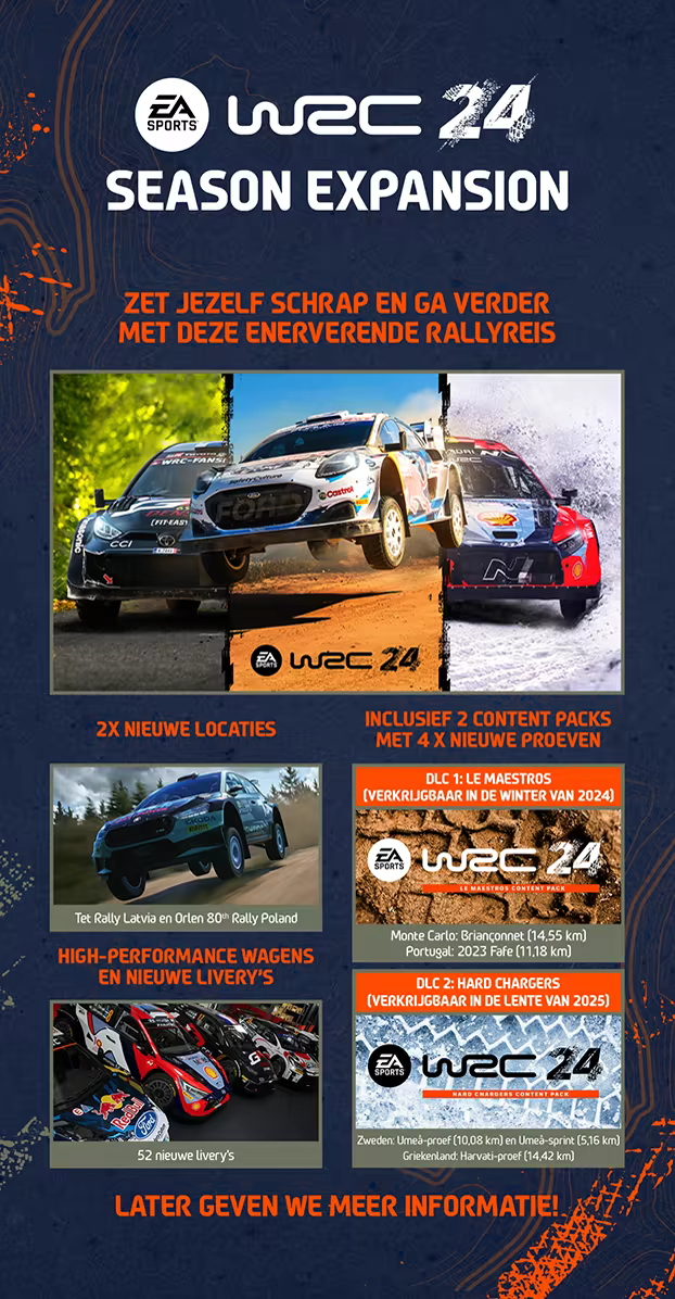 Beleef de spanning van het rallyseizoen van 2024 met nieuwe locaties, momenten, proeven, high-performance voertuigen, nieuwe livery's en gelicenseerde crews. Zet jezelf schrap en ga verder met deze enerverende rallyreis.