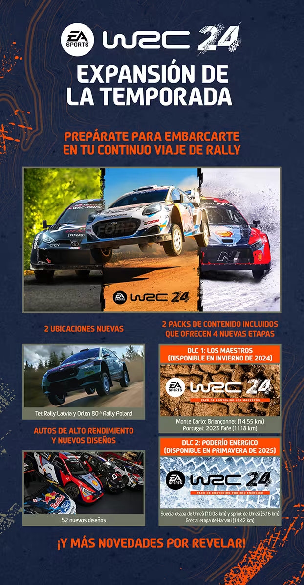 Experimenta la emoción de la temporada 2024 de rally con nuevas ubicaciones, momentos, escenarios, vehículos de alto rendimiento, nuevos diseños y tripulaciones con licencia. Abróchate el cinturón y prepárate para embarcarte en tu continuo viaje de rally.