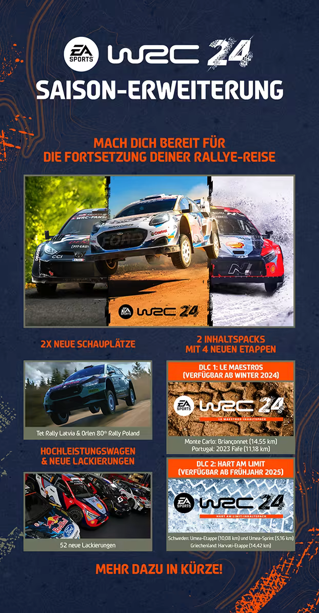 Verbessere dein Rallye-Erlebnis mit der WRC 2024 Saison-Erweiterung. Entdecke aufregende neue Schauplätze wie die Tet Rally Latvia und die ORLEN 80th Rally Poland. Fahre die neuesten Hochleistungsfahrzeuge wie den Ford Fiesta Rally3 Evo und den Toyota GR Yaris Rally1 HYBRID '24. Individualisiere deine Rallye-Autos mit mehr als 50 neuen Lackierungen und miss dich mit 52 offiziellen Crews. Schnall dich an und mach dich bereit für deine Rallyereise.