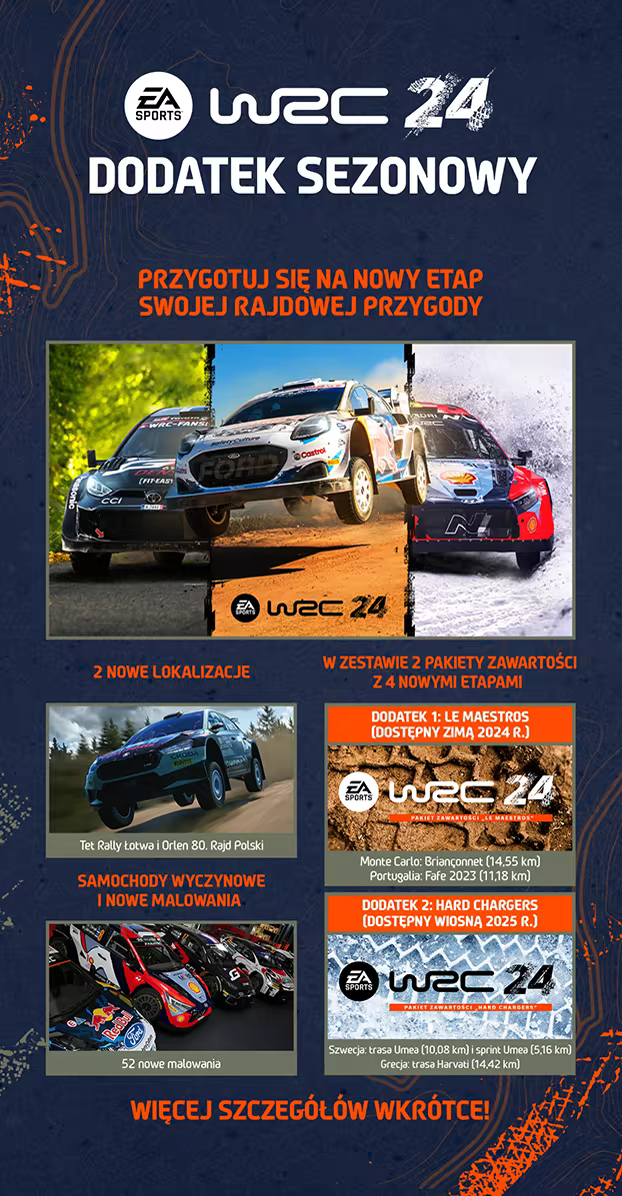 Zwiększ swoje wrażenia z rajdów dzięki Dodatkowi sezonowemu WRC 2024. Odkryj nowe porywające lokalizacje, Tet Rally Łotwa i Orlen 80. Rajd Polski. Prowadź najnowsze auta wyczynowe, w tym Forda Fiestę Rally3 Evo i Toyotę GR Yaris Rally1 HYBRID '24. Personalizuj swoje auta rajdowe dzięki ponad 50 nowym barwom i zmierz się z 52 oficjalnymi ekipami. Zapnij pasy i przygotuj się na rajdową przygodę!
