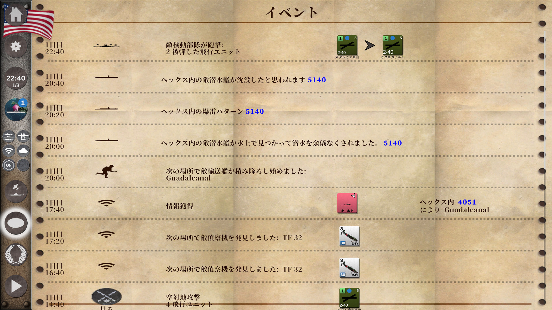 - コンピュータが敵艦の動きと遭遇対応を処理します