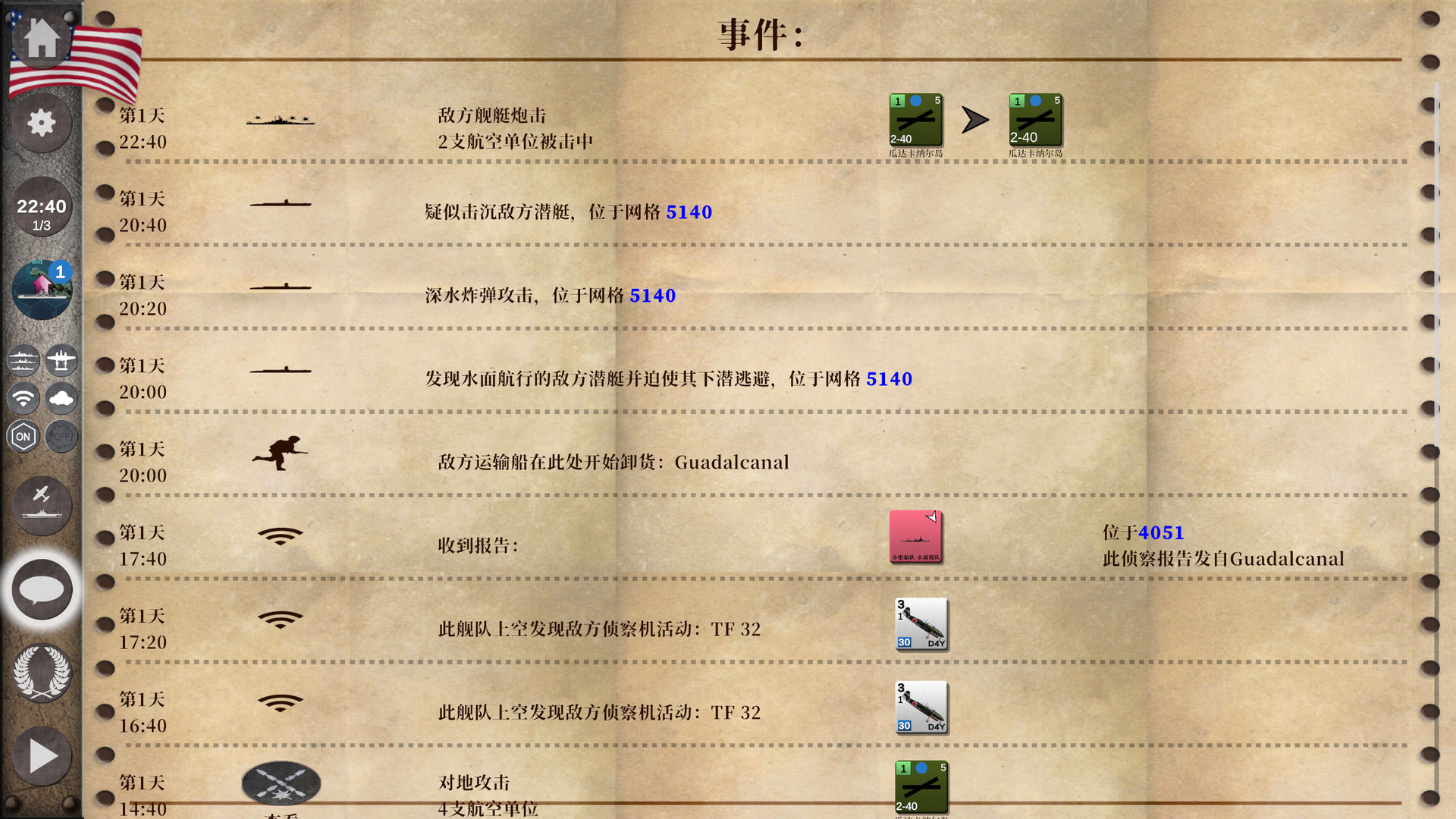 - 查看舰船图标的背面,上面记录了其装备的鱼雷和深水炸弹情况,以及在真实历史中此舰船沉没的时间