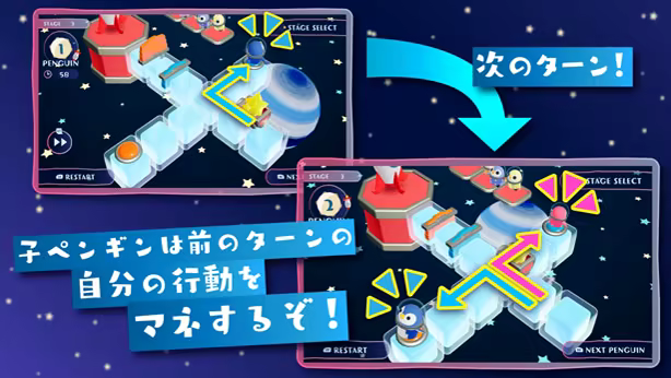 自分の行動を真似(リプレイ)する子ペンギンと協力して、スターを乗せたトロッコをロケットへと導け! 様々なギミックを攻略し、限られた手数でゴールを目指すヒラメキパズルアクション!