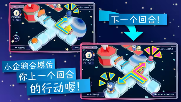 与会模仿(重现)你行动的小企鹅一起合力把装载着星星的小车运到火箭那里! 在有限的回合内破解各种机关抵达终点,灵光一闪解谜闯关!
