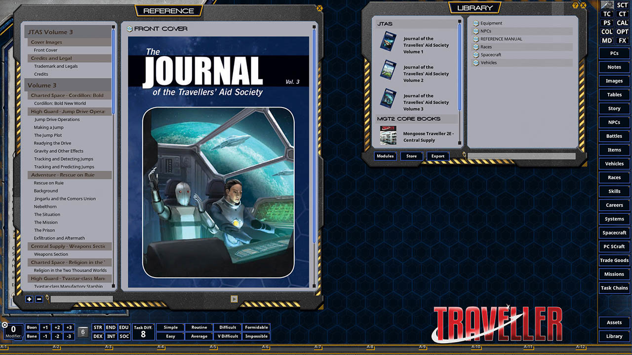 Requires: The free Fantasy Grounds virtual tabletop (VTT) software and a one time purchase of the Traveller 2E (Mongoose) ruleset.