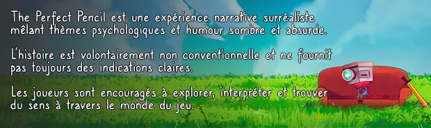 The Perfect Pencil est un jeu de plateforme d’action surréaliste où l’exploration et les choix façonnent tout. Découvrez des chemins cachés, rencontrez des personnages étranges et dévoilez une histoire psychologique pleine d’humour absurde.