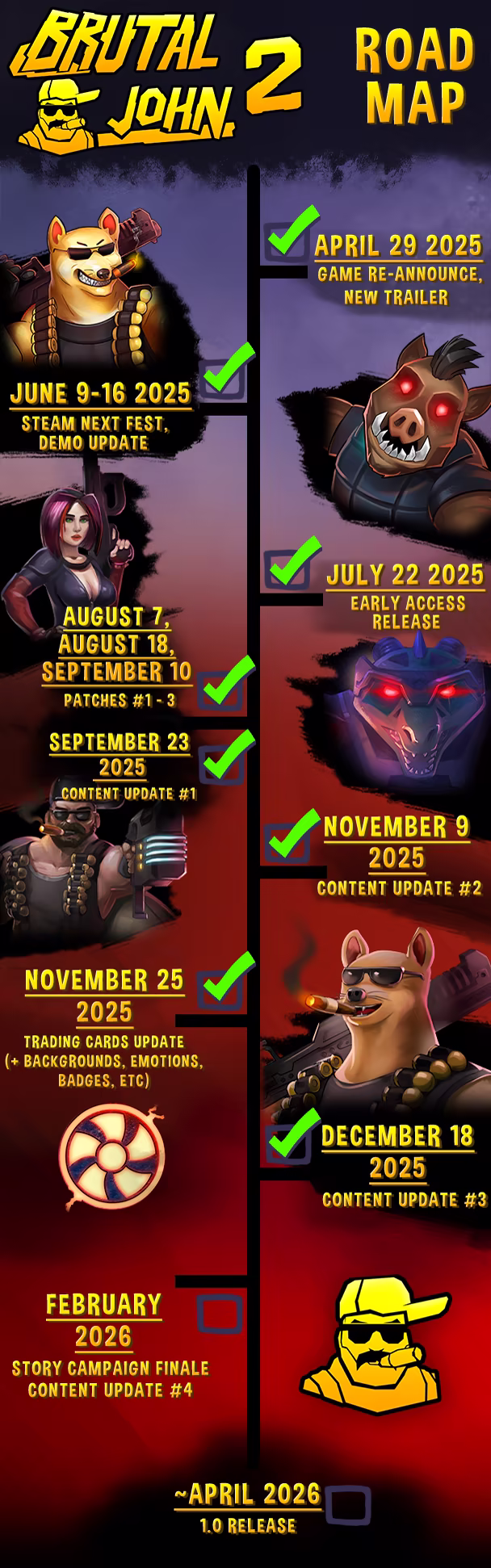 „This game wouldn’t be the same without your help. Like we did with the demo version - we will watching the Steam forums closely, taking in all your feedback, and doing regular updates. Got ideas? Bugs? Memes? Easter Eggs? We’re here for it. Let’s build BRUTAL JOHN 2 together.“
