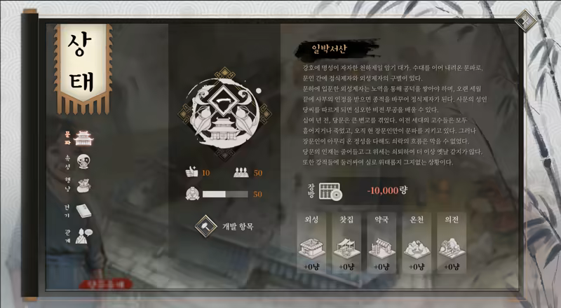 이를 통해 문파의 방침을 바꾸고, 가능한 모든 방법을 동원해 문파를 강하게 키워 승리를 향해 나아가십시오!