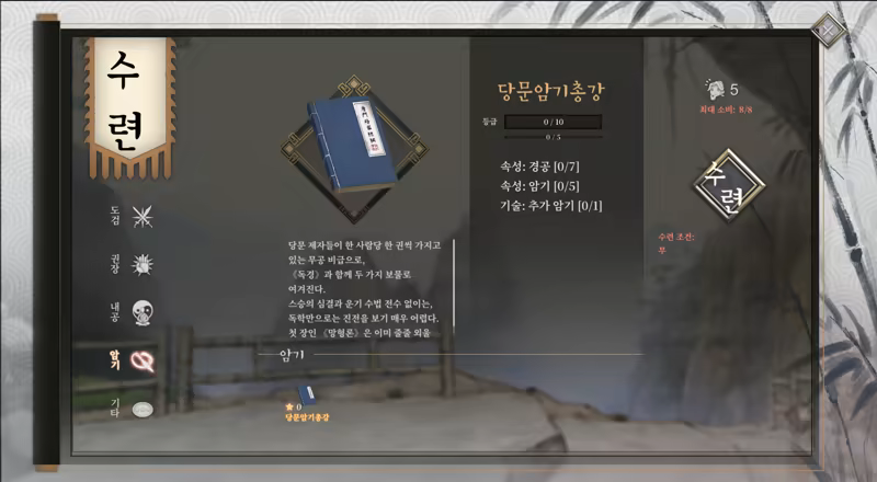 플레이어는 연단실에서 독을 연마하고 대장간에서 암기를 단조하며, 때로는 온갖 잡일을 도맡아 사부와 사형들의 환심을 살 수 있습니다.
