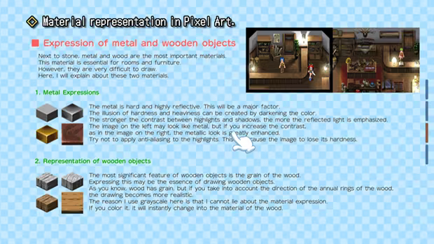 I think it explains the material expression in pixel art in an easy to understand way! (This is my personal opinion, but...)