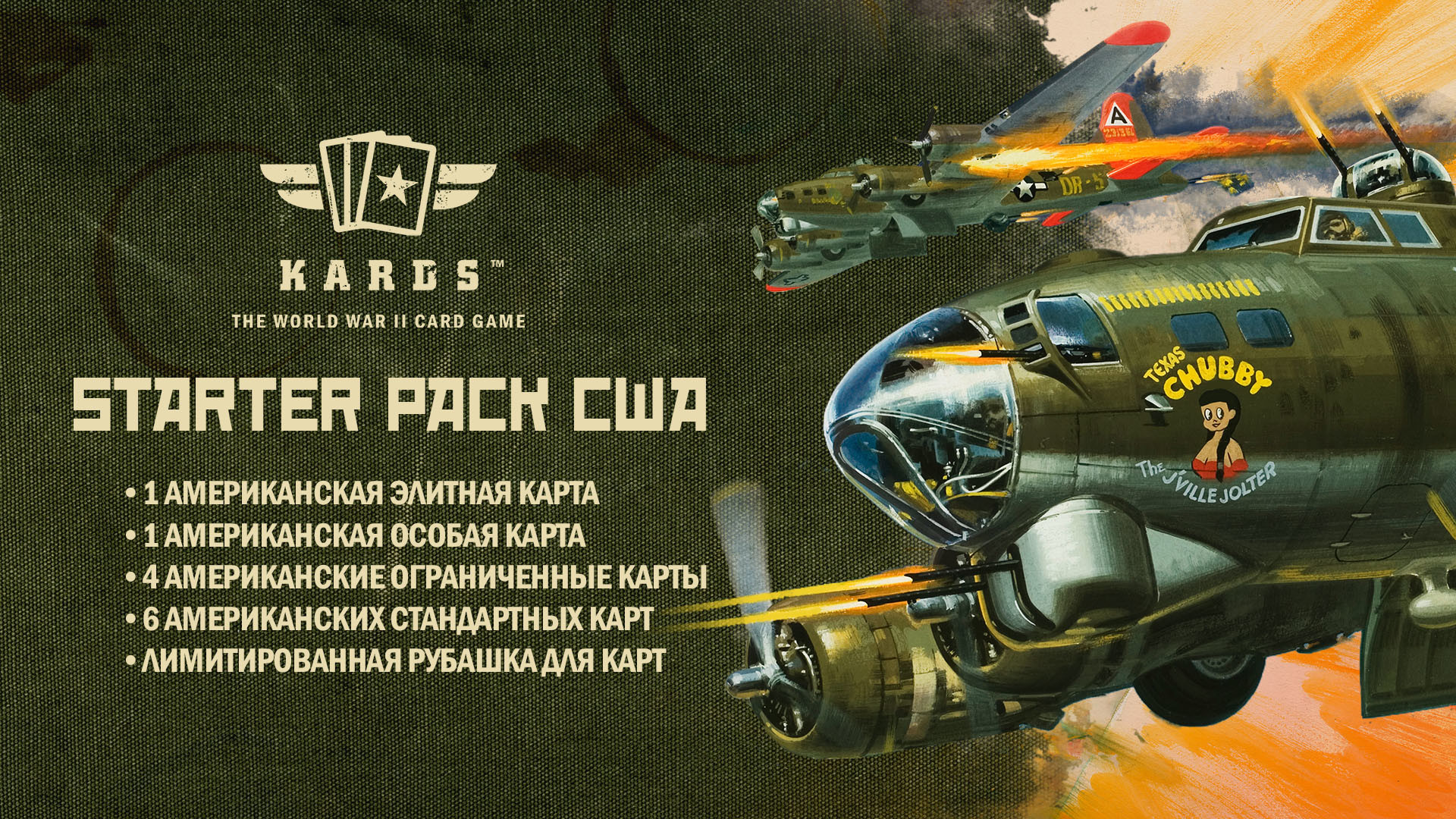 Стартовый набор США содержит карты, которые помогут вам штурмовать линию фронта и взять под контроль поле битвы. Легендарный 507-й Десантный Полк усилит ваши войска, в то время как B-17 Летающая Крепость прикроет их с неба.