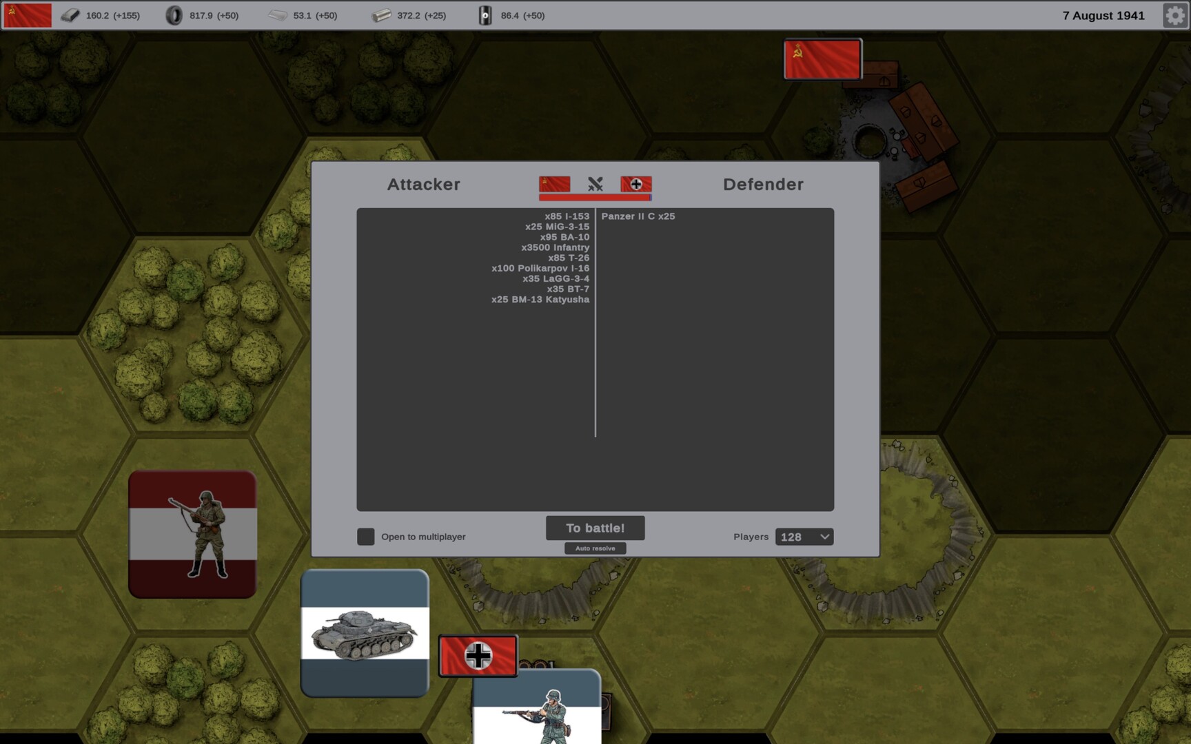 You will have resources to manage (Steel, Oil, Rubber, Aluminium, Tungsten) in order to produce units, create armies, and capture victory points. It will play like our first game Hex of Steel, but with more resources, and battles in first person if you wish so.