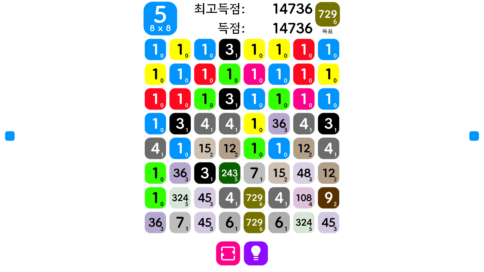 모두 잠금 해제하면 게임 모드는 1블록의 타입수와 격자의 사이즈로 바뀌어 전체적으로 6종류로 플레이할 수 있습니다. 1블록의 타입은 색상과 형태에 따라 설정으로 선택할 수 있습니다. 3개 이상의 같은 숫자의 블록(1 블록이면, 같은 타입)이 옆으로 하면 콤비네이션이라고 합니다. 그 콤비네이션의 블록의 숫자를 모두 더한 계산의 숫자로 하나의 새로운 블록이 됩니다. 다음 블록을 교체하여 블록을 이동할 수 있습니다. 콤비네이션이 되지 않으면 이동할 수 없습니다.