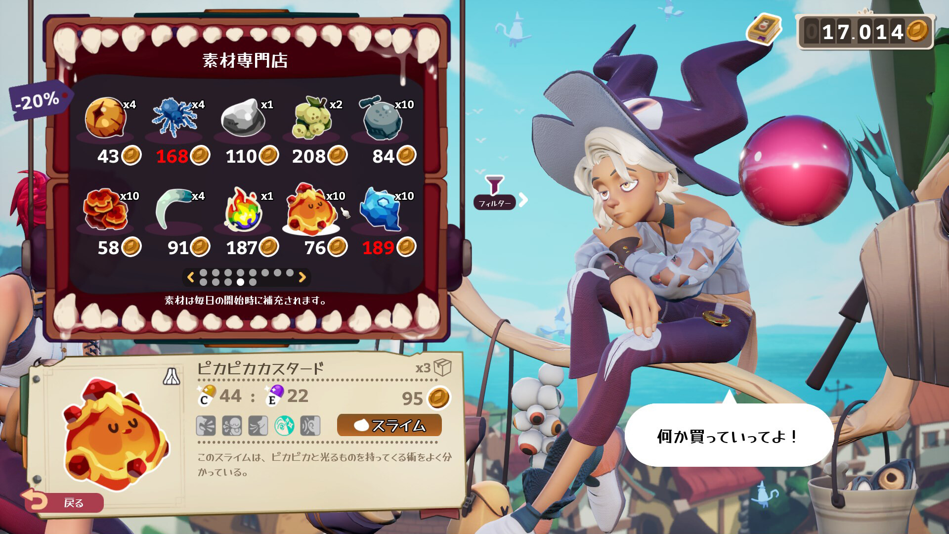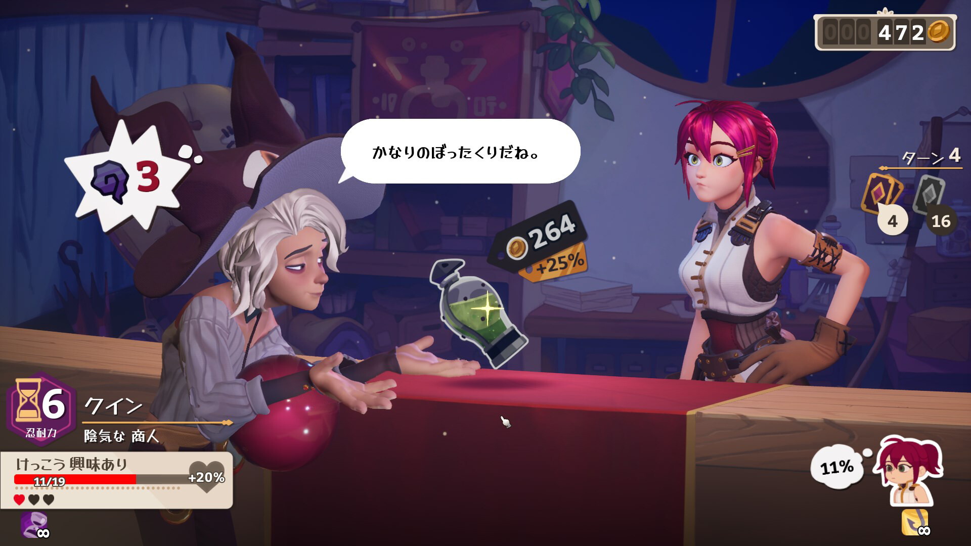 コインの一枚一枚が勝負の交渉には緊張感が走るが、カードをうまく使えばシルヴィアのストレスも軽減可能。ラフタの冒険者や他の店主と友好関係を築くことで、さらに高度な交渉術を学べる。