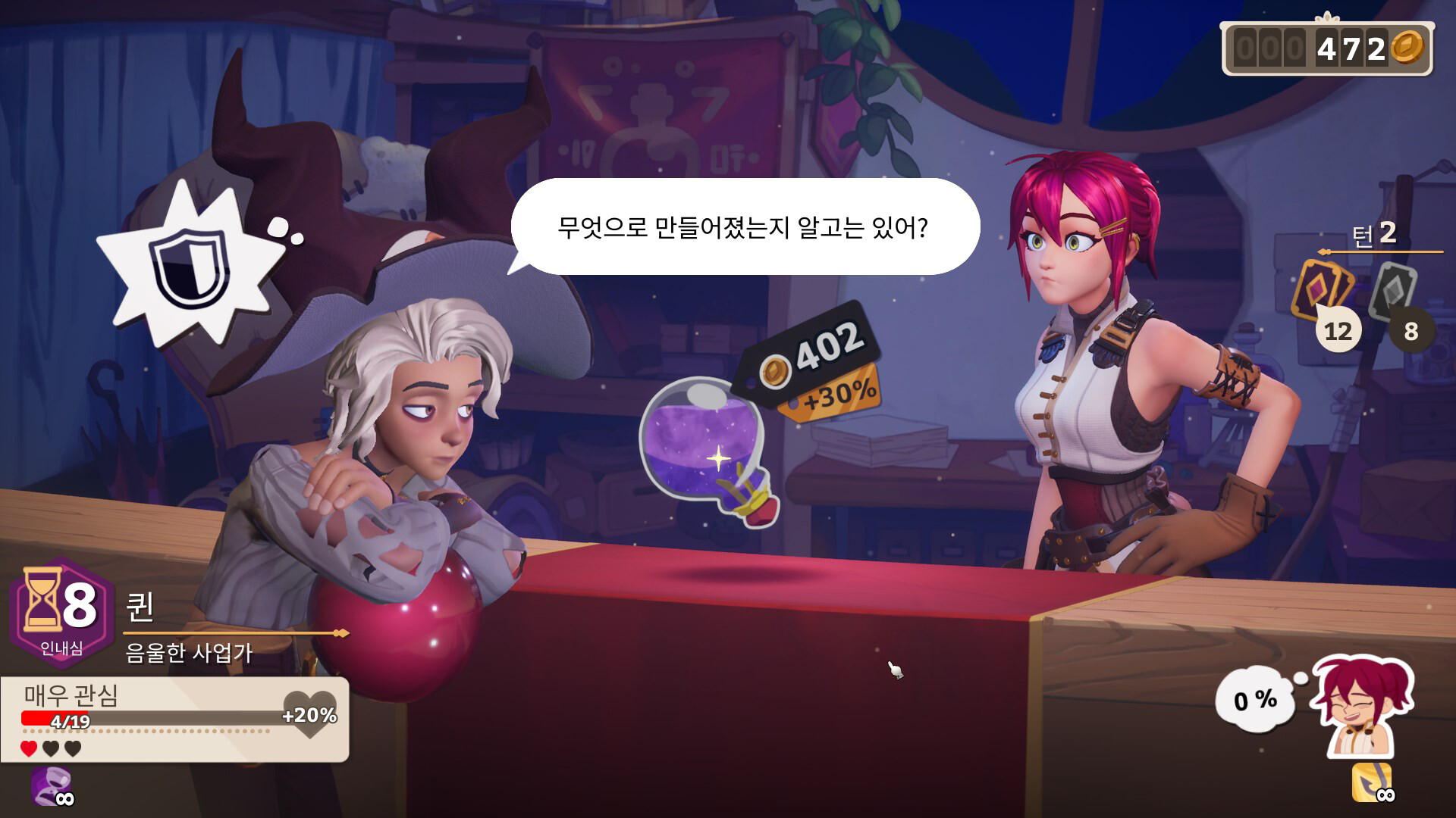 당신은 삼촌의 물약 상점과 물려받았지만, 삼촌의 엄청난 빚도 함께 물려받았습니다. 물약 제조를 빨리 시작하는 게 좋겠어요! 이야기 중심으로 진행되는 이 덱 제작 상점 시뮬레이터에서 상점을 꾸미고, 영웅을 고용해서 재료를 모으고, 다른 상인과 친해져서 (또는 사랑에 빠져서) 새로운 흥정 전략을 배우고, 경쟁자와 정면 대결을 펼치세요.