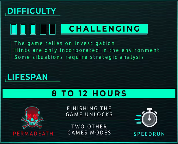 • The game relies on investigation and the difficulty varies mainly with the amount of information you collect: the less you have, the more difficult it becomes