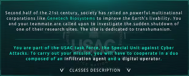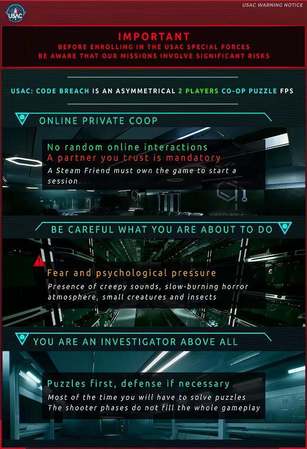 USAC: Code Breach™ is a unique coop experience set in a cyberpunk universe. As a special police unit, you and your partner are called in to investigate the unexpected shutdown of a high-tech research facility. Between reflection and action, you must survive a situation that is beyond you.